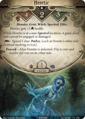 While Heretic is at a non-Spectral location, it gains aloof and cannot be engaged or damaged.